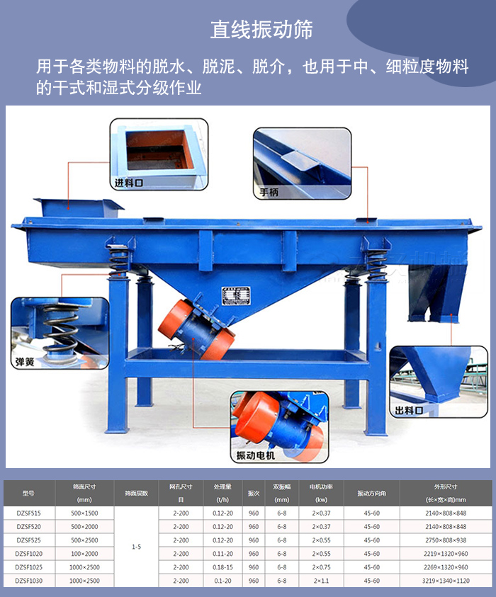 直線振動(dòng)篩篩箱的運(yùn)動(dòng)軌跡為直線或接近直線,它有兩個(gè)軸,所以又稱雙軸振動(dòng)篩。直線振動(dòng)篩水平或傾斜安裝,這類振動(dòng)篩結(jié)構(gòu)緊湊,運(yùn)行平穩(wěn),被廣泛用于各類物料的脫水、脫泥、脫介,也用于中、細(xì)粒度物料的干式和濕式分級作業(yè)。我廠生產(chǎn)的直線振動(dòng)篩種HZSF型號就是直線振動(dòng)篩代表性的產(chǎn)品。