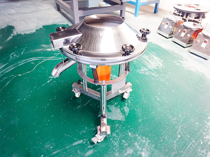 450過濾篩——直徑為450mm,由電機驅(qū)動重錘激振,篩體產(chǎn)生水平、垂直、傾斜的三次元運動,使含水物料在篩網(wǎng)上被拋起并由中央向外旋轉(zhuǎn)擴散到出料口排出,含水物料在篩網(wǎng)上面的運動中,細(xì)小顆?;蛞后w透過篩網(wǎng),通過選擇安裝相應(yīng)的篩網(wǎng)和篩網(wǎng)層數(shù)使物料完成篩選分級或過濾,分選出的物料由各自的出料口分別自動排出。是一臺單層篩分和過濾使用的振動篩,被各個廠家和用戶叫做液體專用振動篩,因為機身小的原因,所以它的處理量不多,適用于小產(chǎn)能要求。