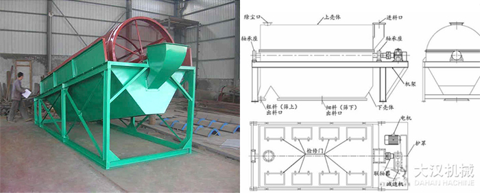 電機(jī)驅(qū)動(dòng)滾筒軸線作旋轉(zhuǎn)運(yùn)動(dòng),減速機(jī)調(diào)節(jié)筒體以一定的轉(zhuǎn)速旋轉(zhuǎn),物料由進(jìn)料口進(jìn)入筒體內(nèi),在旋轉(zhuǎn)產(chǎn)生的離心力作用下,物料在筒內(nèi)翻滾,自上而下通過分級篩網(wǎng)析出,由于篩網(wǎng)分級尺寸不同,物料逐漸被分離篩選,粒度合格的物料經(jīng)篩分后落入到各自的漏斗,然后由人力方式運(yùn)出或通過輸送機(jī)自流送往成品站。合格產(chǎn)品經(jīng)過下端出料口排出,顆粒較大,分選不合格的產(chǎn)品經(jīng)另一排料口排出,筒內(nèi)清理裝置,使篩網(wǎng)不宜被阻塞。