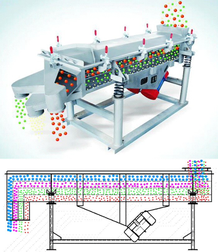多層直線振動(dòng)篩利用雙臺(tái)電機(jī)作為振動(dòng)源,物料在篩網(wǎng)上受激振力的作用被拋起,同時(shí)向前做直線運(yùn)動(dòng),物料從給料機(jī)均勻地進(jìn)入直線篩進(jìn)料口后,通過(guò)多層篩網(wǎng)產(chǎn)生了數(shù)種不同規(guī)格的篩上物、篩下午,后分別又從各自的出口排出。