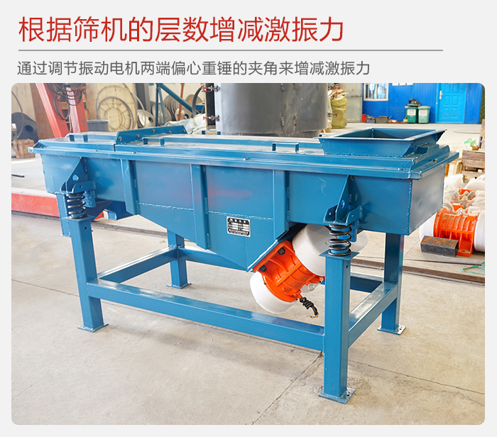 5、用戶可根據(jù)篩機的層數(shù),物料比重不同來增減篩機的激振力(通過調節(jié)振動電機兩端偏心重錘的夾角來增減激振力),使篩機達到最佳的篩分效果。