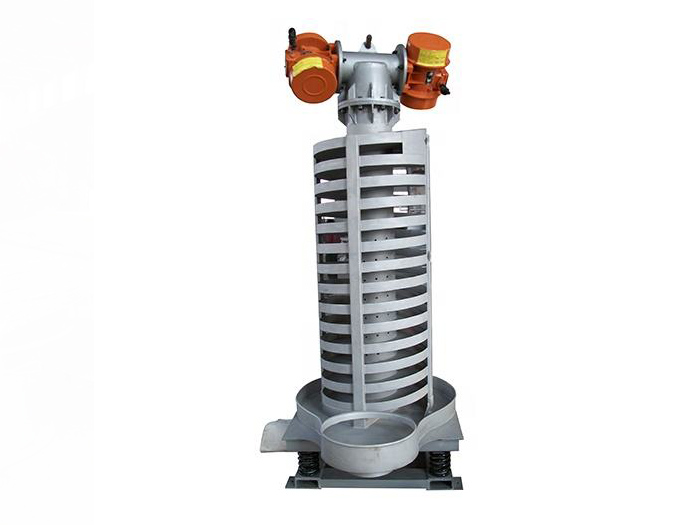 SZC系列垂直振動提升機的驅(qū)動裝置振動電機安裝在輸送塔下部,兩臺振動電機對稱交叉安裝,輸送塔由管體和焊接在管體周圍的螺旋輸送槽組成,輸送塔座于減振裝置上,減振裝置由底座和隔振彈簧組成。當垂直輸送機工作時,根據(jù)雙振動電機自同步原理,由振動電機產(chǎn)生激振力,強迫整個輸送塔體作水平圓運動和向上垂直運動的空間復合振動,螺旋槽內(nèi)的物料則受輸送槽的作用,作勻速拋擲圓運動,沿輸送槽體向上運動,從而完成物料的向上(或向下)輸送作業(yè)。